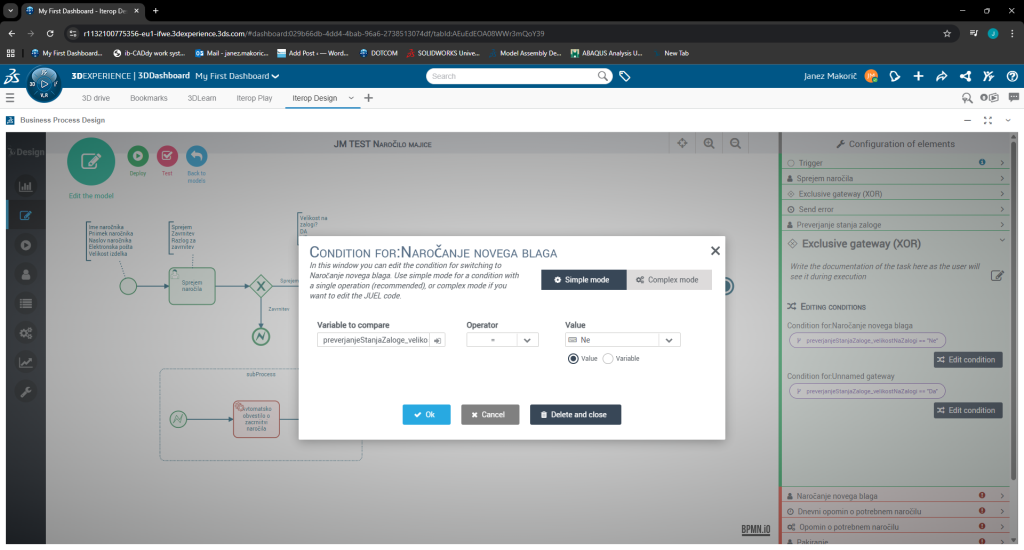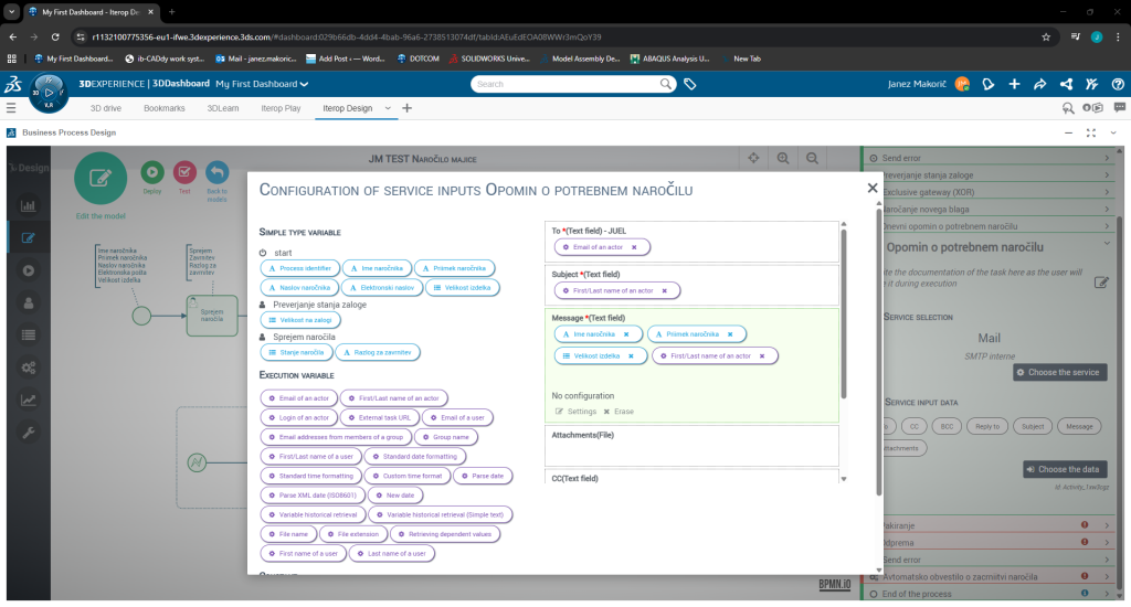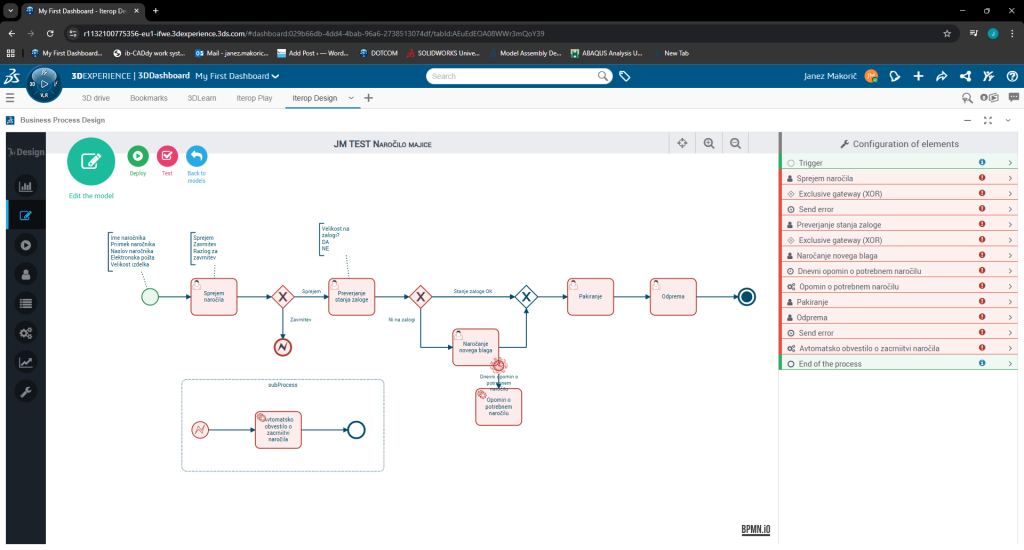 V tej fazi proces še ne deluje popolnoma, saj je potrebno posameznim dejavnostim še dodati ustrezna imena ter jih pravilno konfigurirati. Šele s tem korakom bo proces pripravljen za testiranje in nadaljnjo optimizacijo.
