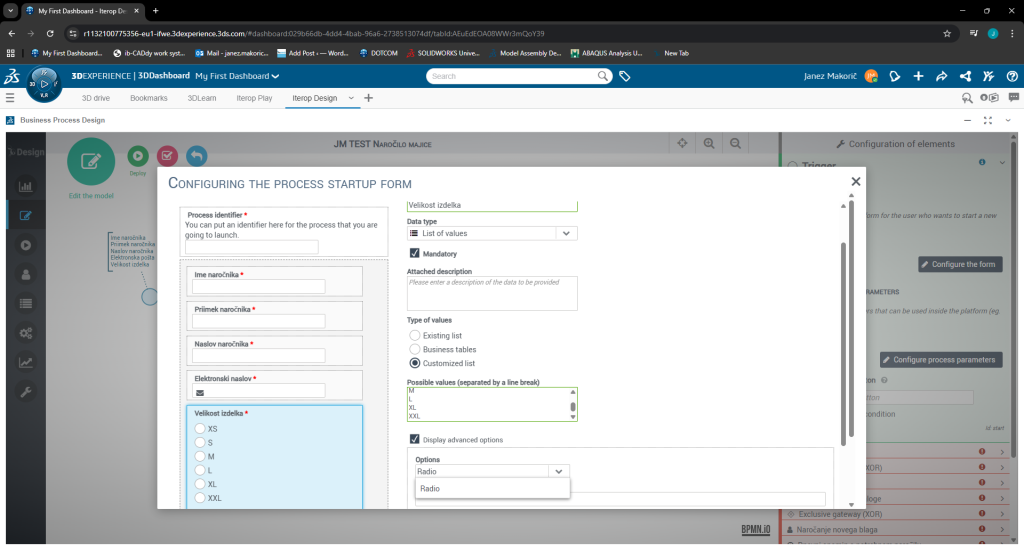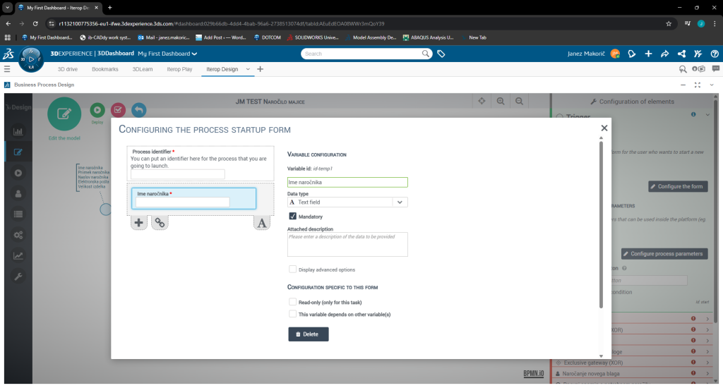 V desnem meniju izberemo možnost Configure the form. Na tem mestu določimo, katere podatke mora uporabnik vnesti ob zagonu procesa.