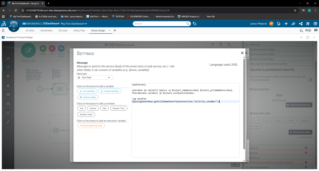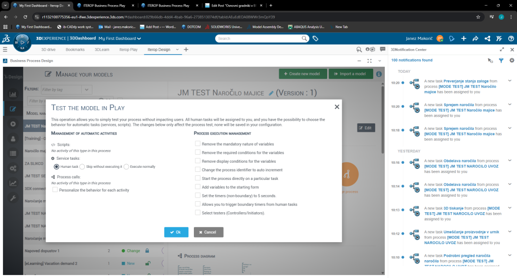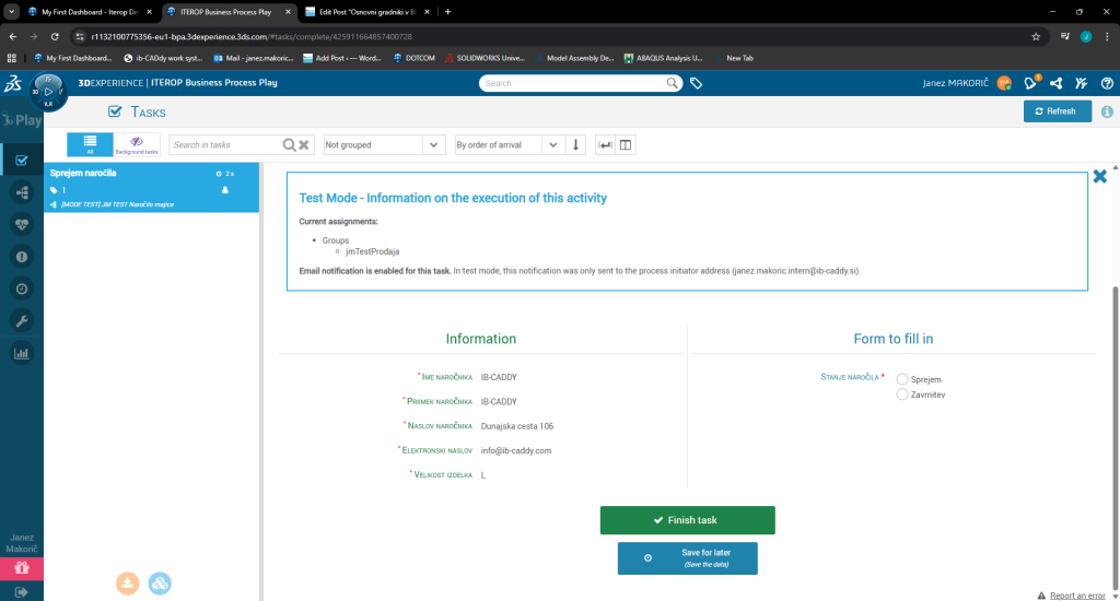 Ko smo prepričani, da model deluje pravilno, izvajamo vse naloge, potrebne za uspešno zaključitev procesa. To vključuje tako uporabniške dejavnosti kot servisne naloge, ki zagotavljajo, da so vsi koraki dokončani, podatki pravilno zabeleženi in posredovani naprej. Ko smo prepričani, da proces deluje brez napak, ga lahko izdamo, kar pomeni, da postane aktiven in ga lahko uporabniki začnejo uporabljati. S tem preide iz faze testiranja v produkcijsko okolje, kjer podpira vsakodnevno delo in zagotavlja, da proces teče gladko in učinkovito.