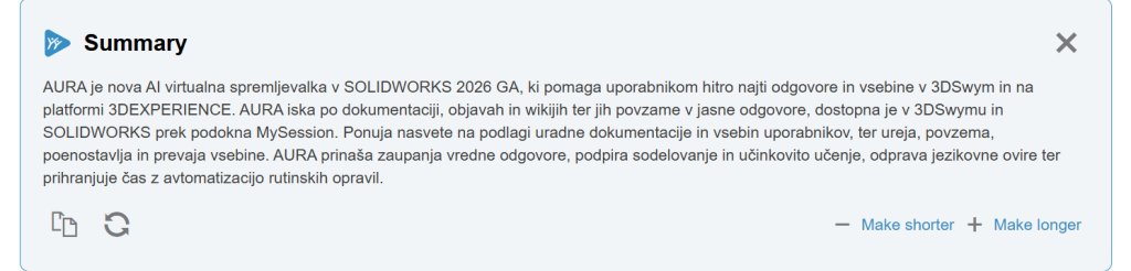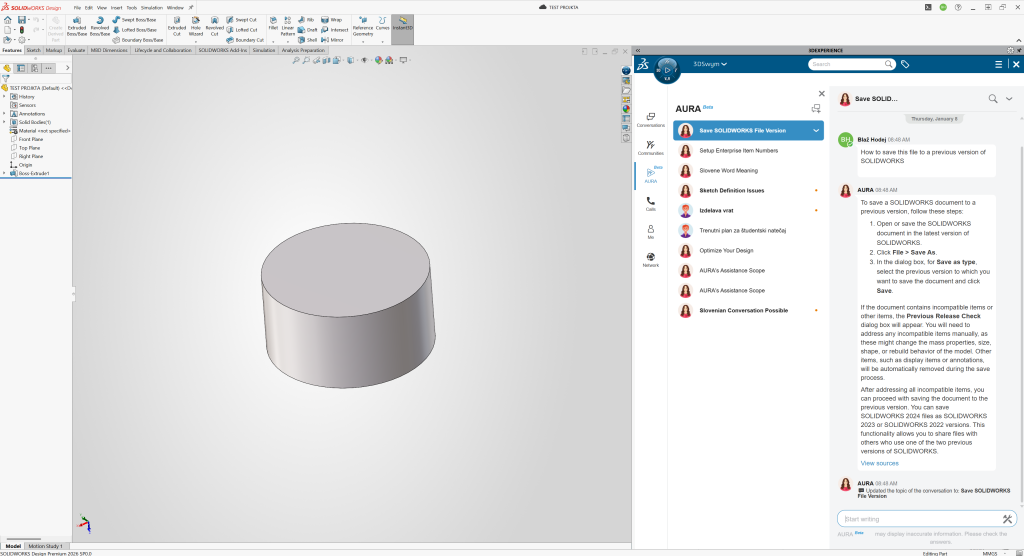 AURA omogoča iskanje po dokumentaciji, objavah in wikijih ter jih povzame v jasne, uporabne odgovore, na primer kako shraniti model v starejšo različico SOLIDWORKS. Dostopna je kjerkoli v 3DSwymu in neposredno v SOLIDWORKS prek podokna MySession, kar bistveno poenostavi in pospeši vsakodnevno delo.
