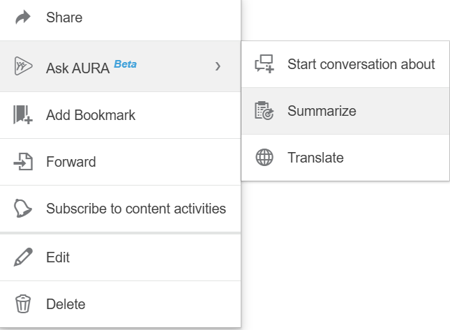 - AURA se osredotoča na besedilne vsebine v objavah, wikijih, idejah in uradni dokumentaciji 3DSwym. Dokumenti in drugi formati so delno podprti.