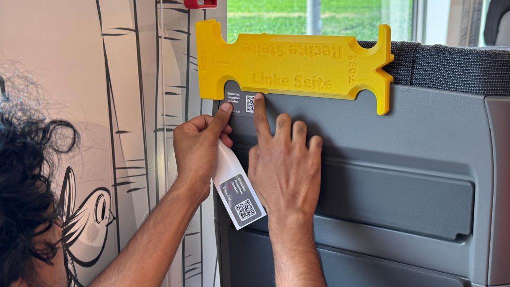 - Operativna prepustnost in učinkovitost: Pri novem vlaku ICE L se uporablja 3D-tiskano pozicionirno orodje (rumena šablona) za namestitev QR-kod in piktogramov. To orodje bistveno povečuje operativno prepustnost v delavnicah, saj je delo hitrejše, natančnejše in posledično cenejše zaradi manjšega števila delovnih ur.