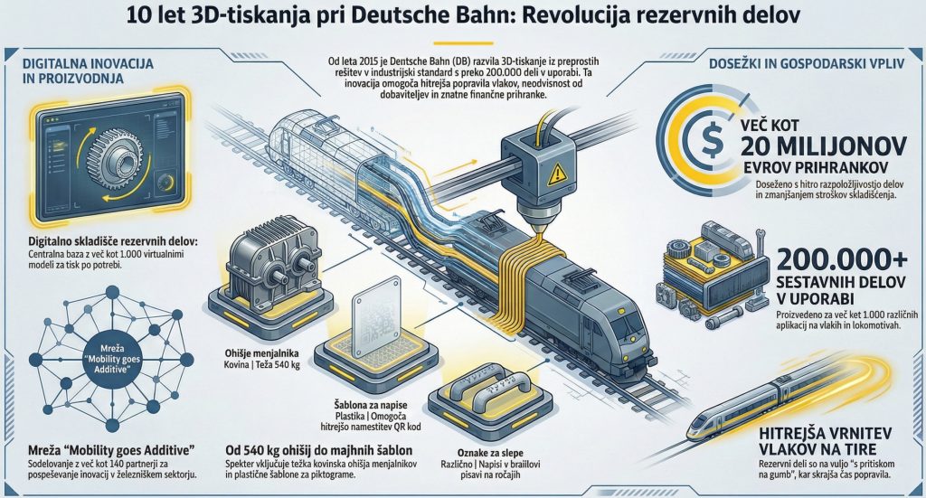 Družba Deutsche Bahn (DB) je leta 2015 sprejela aditivno proizvodnjo (3D-tisk) kot ključno strateško mitigacijo tveganj v odziv na vse večjo volatilnost dobavnih verig in staranje voznega parka. Kar se je začelo kot preizkušanje preprostih polimernih komponent, se je v enem desetletju preobrazilo v robustno industrijsko platformo, ki zagotavlja dolgoročno operativno odpornost.