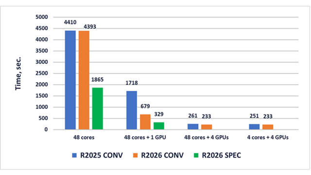 Za prehodne modalne analize je bil uveden tudi nov GPU-podprt State Space solver, ki omogoča učinkovito izvajanje transient modal dynamic simulacij na GPU arhitekturi. Skupaj te izboljšave omogočajo pomembne pohitritve, zlasti pri velikih modelih in zahtevnih dinamičnih obremenitvah, kjer sta čas računanja in skalabilnost ključnega pomena.